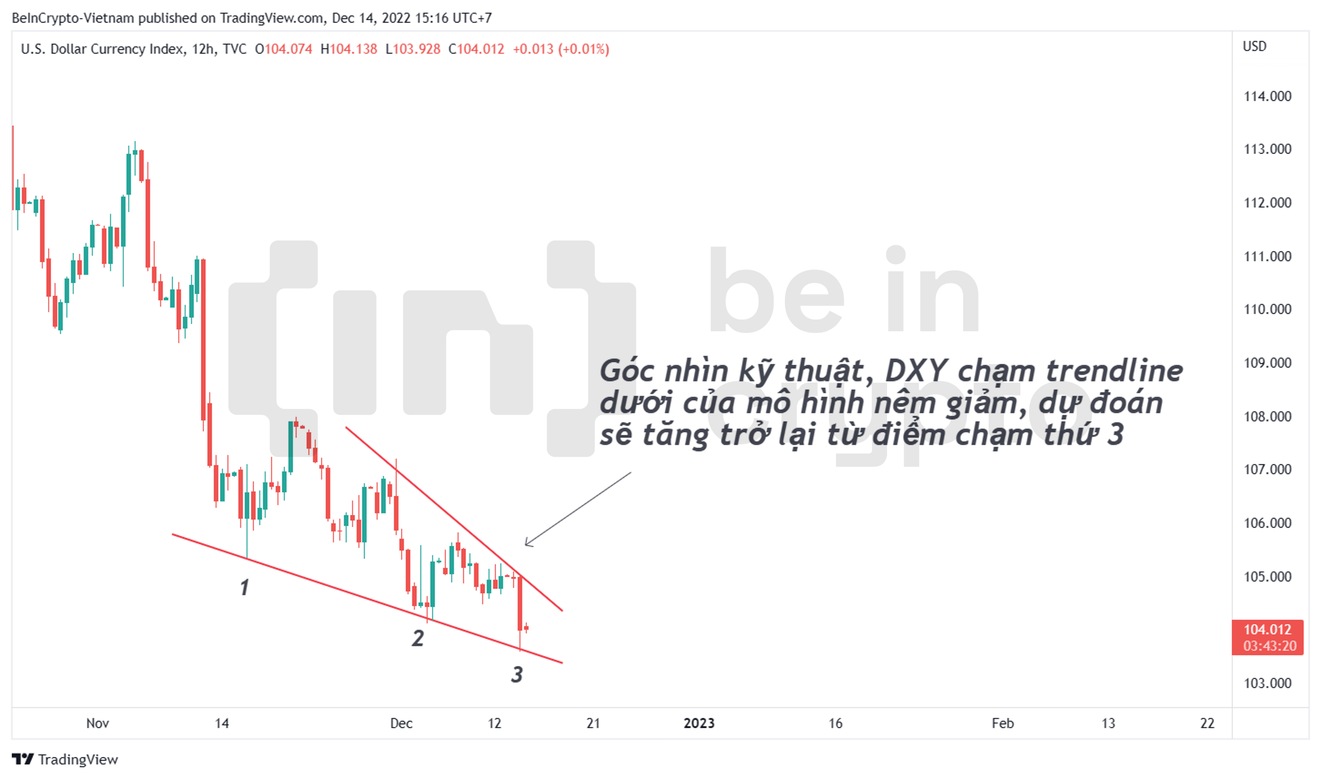 Dù DXY có giảm về dưới 104 điểm hôm qua, nhưng góc nhìn kỹ thuật cho thấy lực giảm này không đủ mạnh để phá vỡ trendline dưới mô hình nêm giảm.
