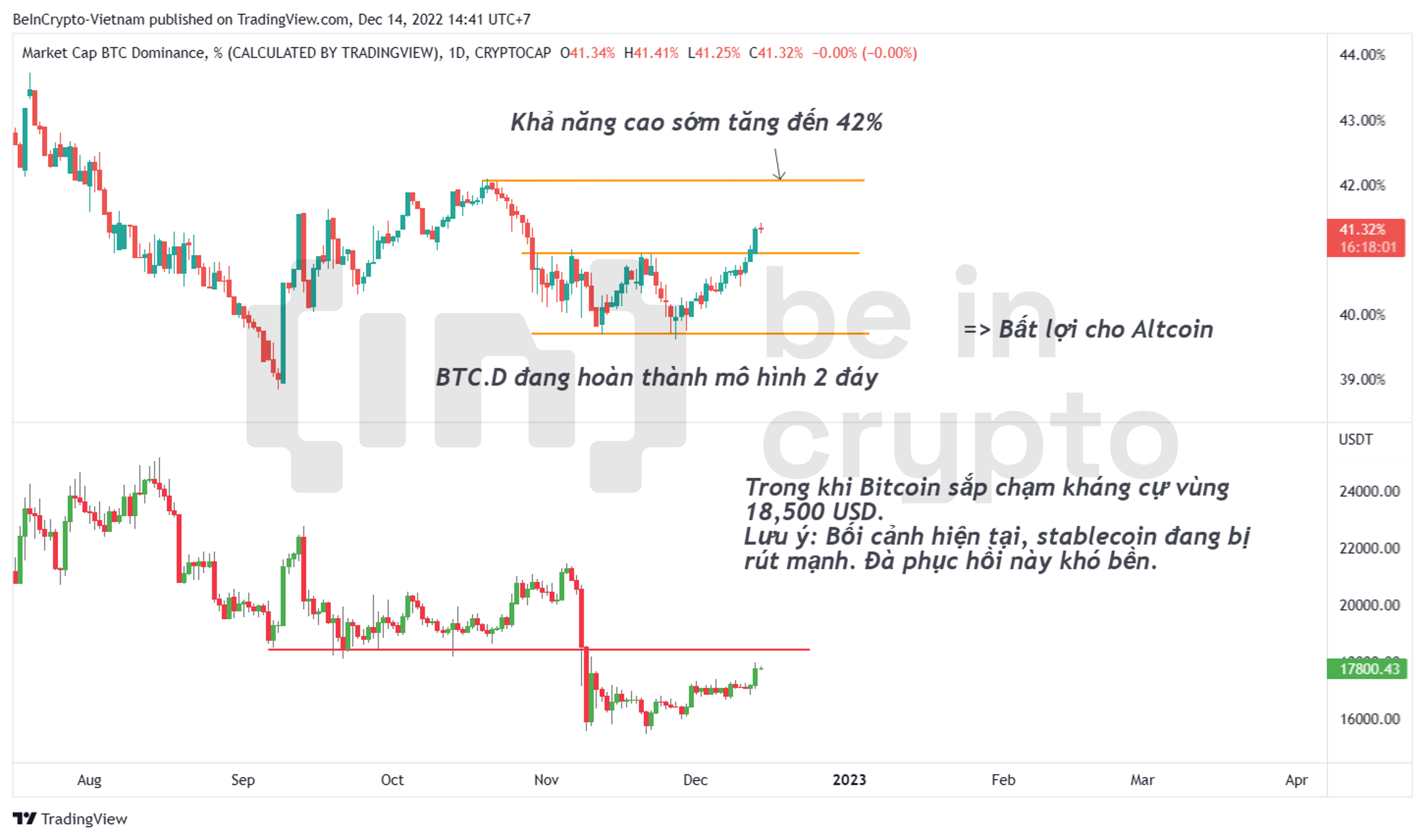 - Bitcoin Dominance đang vẽ nên mô hình 2 đáy và đã xác nhận vượt neckline. Khả năng cao sẽ hoàn thành mô hình tại 42%. Dự đoán, BTC.D sẽ còn tăng tiếp và vượt 42% khi thị trường vẫn chưa hết những tin xấu dồn dập. Dự đoán đà tăng của BTC sẽ gặp khó ở kháng cự mạnh 18,500 USD.