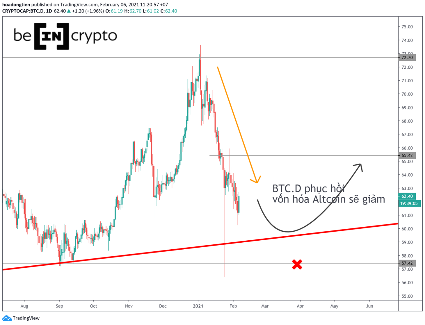 Nếu quan sát dưới góc nhìn phân tích kỹ thuật BTC.D trong khung giờ nhỏ hơn. Thì từ tháng 2 đến tháng 3 có thể sẽ là khoảng thời gian chuyển tiếp từ giảm -> hồi phục của BTC.D. Và khả năng cao như thường thấy, BTC.D phục hồi thì vốn hóa Altcoin sẽ giảm.