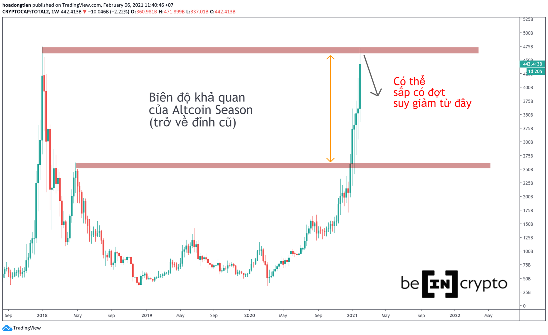 Trong bài viết “Altcoin Season bắt đầu bùng nổ?” BeInCrypto đăng từ hồi đầu tháng 1. Chúng ta cũng đã dự tính vốn hóa Altcoin sẽ trở lại đỉnh cũ. Và hiện nay, biến động này đã hoàn thành.