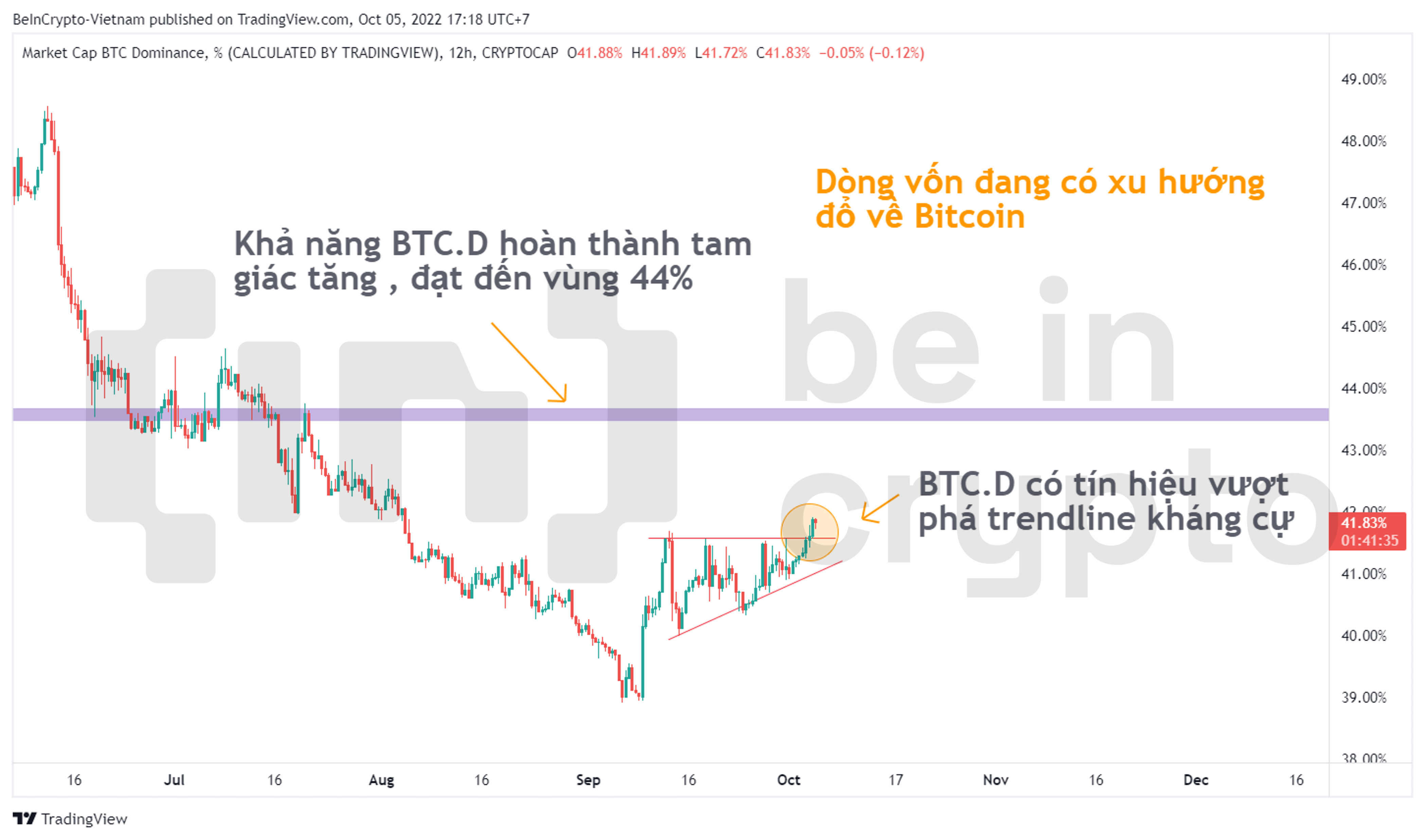 Thời điểm bài viết, BTC.D đang hơn 41.8%. Đây là mức cao nhất trong hai tháng qua.