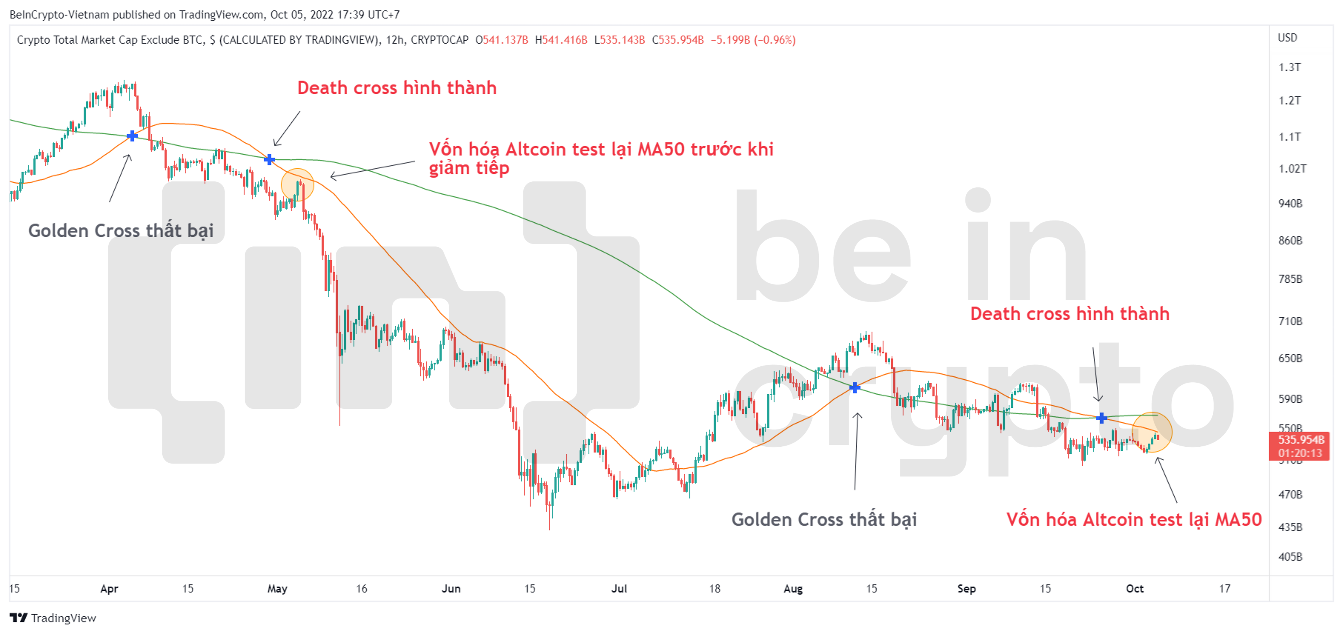 - Tuần cuối tháng 9 vừa qua, vốn hóa Altcoin cũng đã tạo một Death Cross như thế. Sự phục hồi nhẹ hai ngày qua đã khiến vốn hóa re-test MA50 của khung 12h. Điều trùng hợp với giai đoạn giảm tháng 5/2022, là hành vi re-test này là động thái giá cuối cùng trước khi tiếp diễn xu hướng giảm.