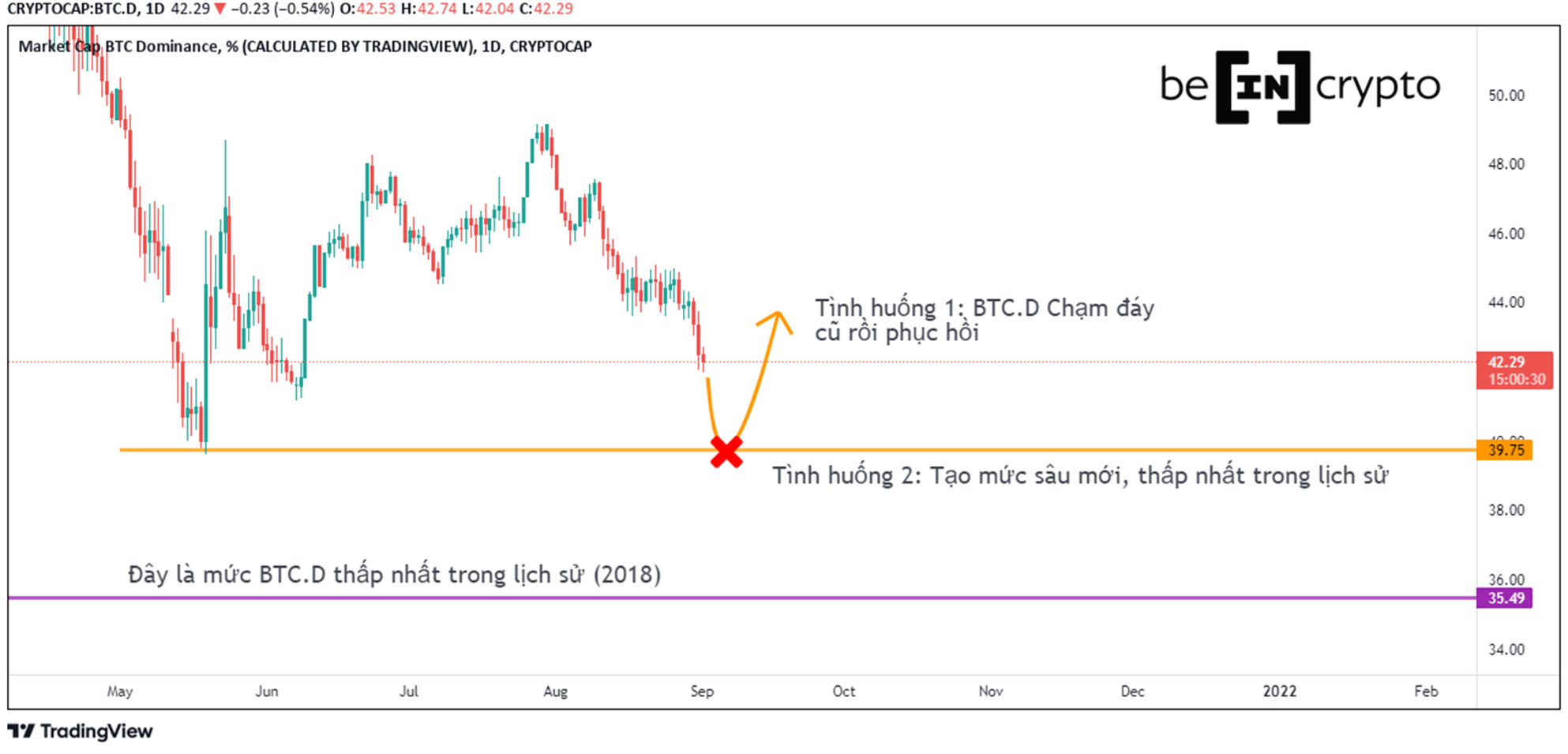 - Tính huống 2: BTC.D sẽ cứ tiếp tục giảm và phá hỗ trợ hồi tháng 5 ở 39.75%. Có khả năng tiến đến mức thấp nhất lịch sử hồi 2018. Lúc này, có thể chúng ta sẽ chứng kiến ETH lập ATH mới và nhiều đồng loạt Alcoin vượt đỉnh cũ. BTC vẫn tăng nhưng không mạnh mẽ bằng. (Xem thêm: Ethererum lại tiếp tục cho tín hiệu tăng?)