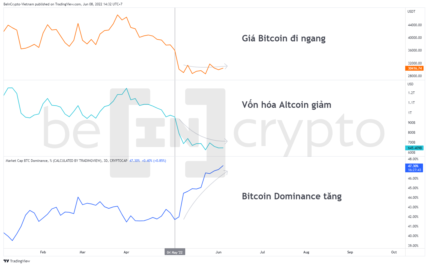 Biến động trên gây nhiều bất lợi cho Altcoin dù giá Bitcoin tăng hay giảm hay sideway. Dòng tiền thị trường hiện tại có thể nhanh chóng chảy trực tiếp ra khỏi Altcoin bằng con đường USDT, không còn bị lệ thuộc vào thanh khoản các cặp Altcoin/BTC.