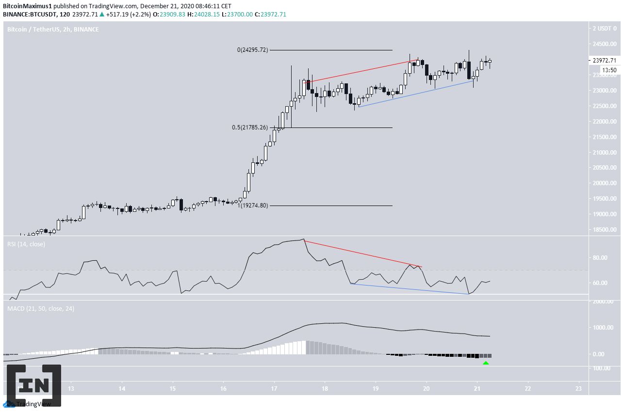 Khi giá BTC phá vỡ 24.000 USD, biểu đồ khung thời gian hai giờ bắt đầu cho thấy tín hiệu điều chỉnh.