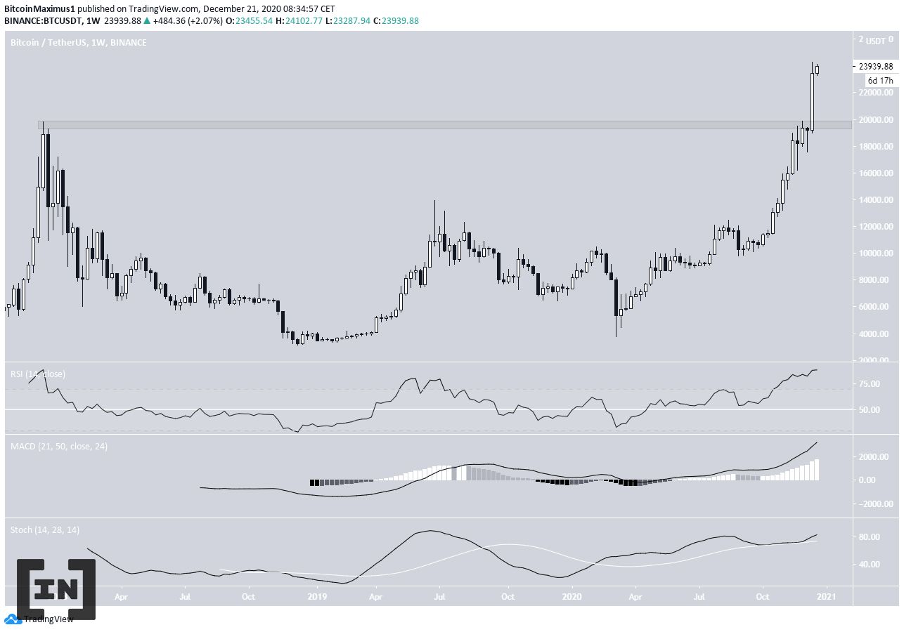 Vào tuần thứ 3 từ ngày 14-21 tháng 12, BTC đã tạo ra một thanh nến tăng giá. Nó vượt qua khu vực 19,500 USD một cách thuyết phục làm bàn đạp chạm mức $ 24,295 USD. Mức giá được thiết lập là mức cao nhất mọi thời đại và vượt qua nhiều vùng kháng cự dài hạn.
