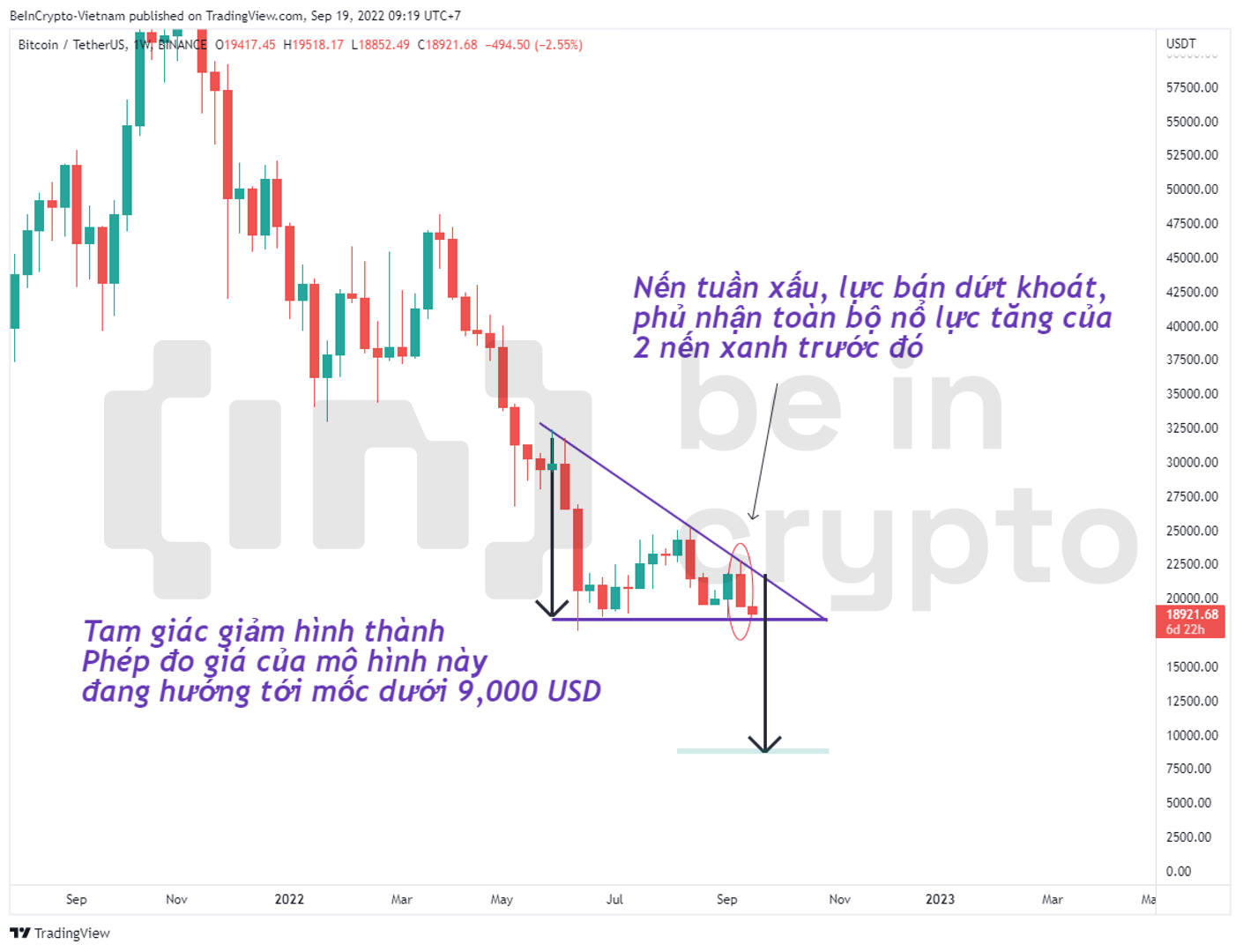 Thời điểm bài viết, BTC biến động dưới 19,000 USD. Đây là vùng biến động tiêu cực cận kề vùng hỗ trợ của mô hình tam giác giảm.