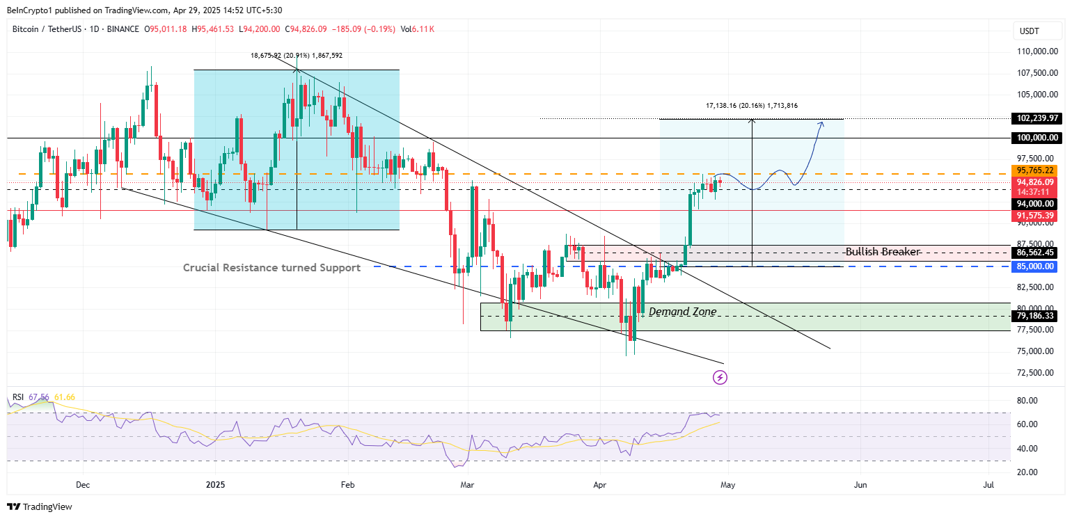 Sau khi vượt qua ngưỡng kháng cự tại 94,000 USD, BTC đang đối mặt với ngưỡng kháng cự ngay lập tức tại 95,765 USD. Nếu có một cây nến quyết định đóng cửa trên rào cản này, có thể mở đường cho sự tăng giá tiếp theo, với giá Bitcoin có khả năng hoàn thành mức tăng dự báo 20% lên 102,239 USD.