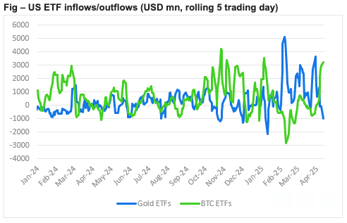 Kendrick chỉ ra dòng vốn vào spot Bitcoin ETF (quỹ giao dịch trao đổi) của Mỹ đang tăng nhanh, đặc biệt khi so sánh với dòng vốn vào ETP vàng (sản phẩm giao dịch trao đổi) đang giảm.