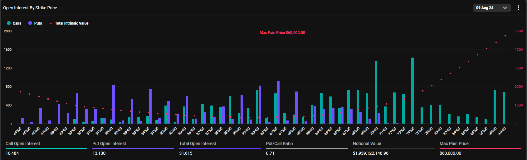 Theo Deribit, 1.94 tỷ USD hợp đồng quyền chọn Bitcoin sẽ hết hạn. Điểm max pain của các hợp đồng này là 60,000 USD.