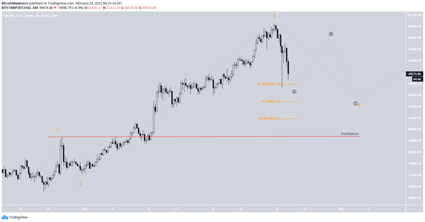 Số lượng sóng hiện tại cho thấy BTC đang trong sóng điều chỉnh thứ 4 (được hiển thị bằng màu cam) của một xung động tăng. Xung động này bắt đầu với mức thấp nhất vào ngày 28 tháng 1, tại $29.000. Sau khi bước sóng này hoàn thành, dự kiến BTC sẽ đạt một mức cao mới ở khoảng gần $60.000.