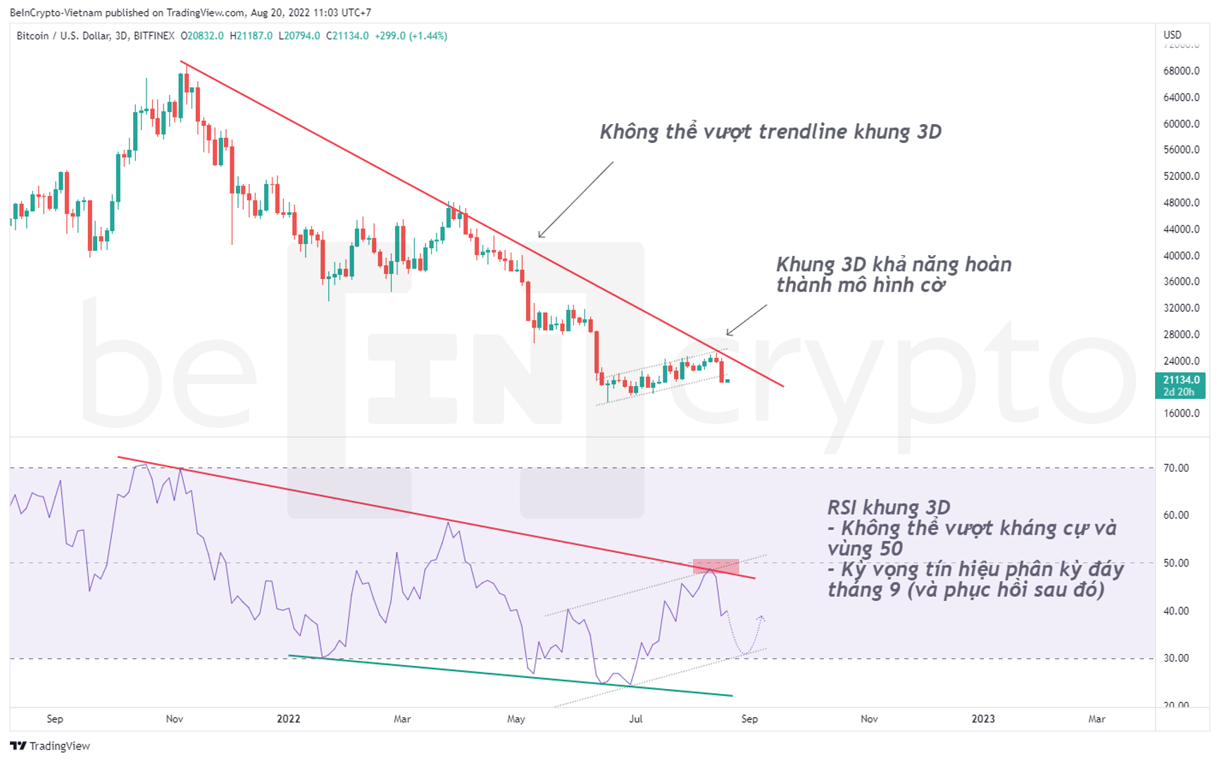 Như bài phân tích kỹ thuật BTC tháng 8 với RSI trước đó, giá BTC không thể vượt qua được những kháng cự quan trọng trong khung 3 ngày (3D). Tâm lý thị trường vẫn chưa thoát khỏi trạng thái sợ hãi.