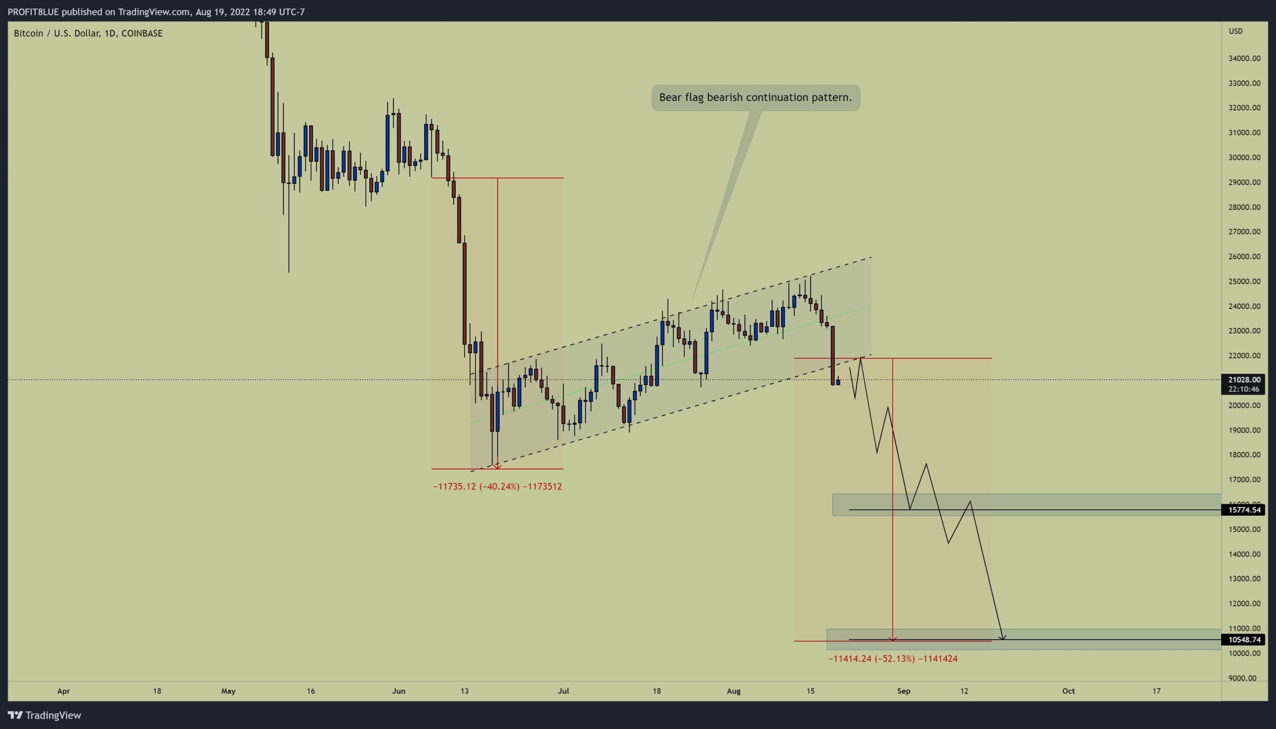 - Do đó, sử dụng phép đo giá của mô hình cờ, BTC có thể giảm về vùng 10,000 USD. Và trong đà giảm đó, giá sẽ phục hồi tạm thời ở vùng 15,000 USD.