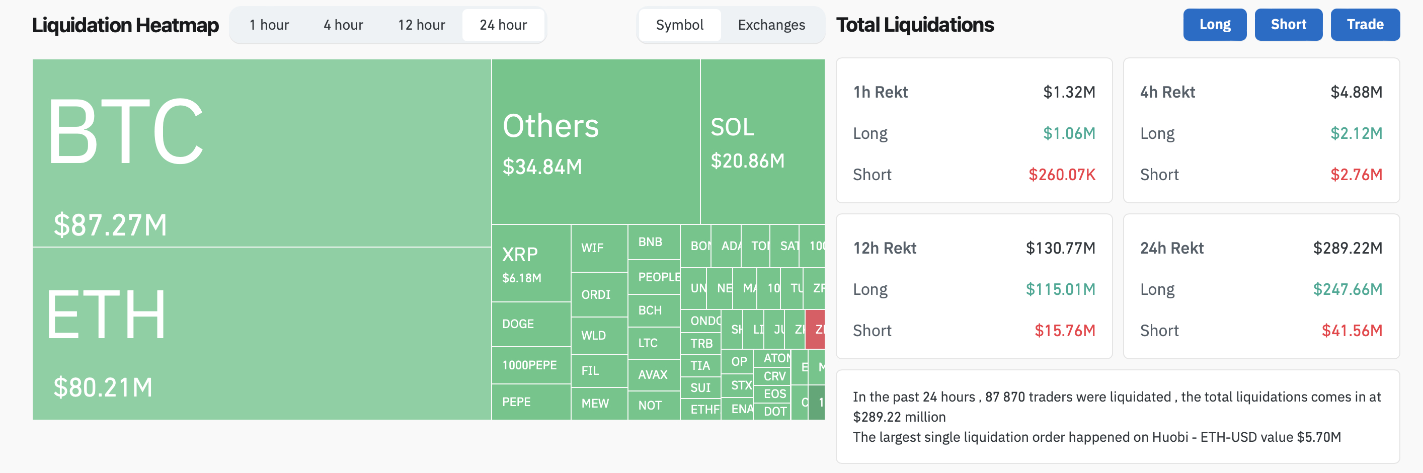 Sự sụt giảm đột ngột này đã kích hoạt một làn sóng thanh lý, xóa bỏ 290 triệu USD cho cả vị thế Long và Short trong 24 giờ qua.