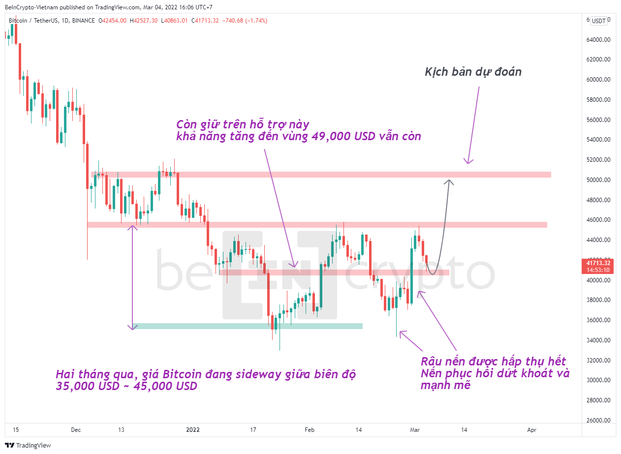Cơ sở để đưa ra dự đoán giá Bitcoin sẽ phục hồi tiếp là vị sự xuất hiện lực mua mạnh trở lại trong những ngày đầu tháng 3. Với râu nến vùng 35,000 USD sâu hơn và nến ngày phục hồi dứt khoát hơn, nên sự xuất hiện của những người chờ mua tại vùng giá điều chỉnh 41,000 USD sẽ khiến cho khả năng đạt đến vùng 49,000 USD cao hơn.