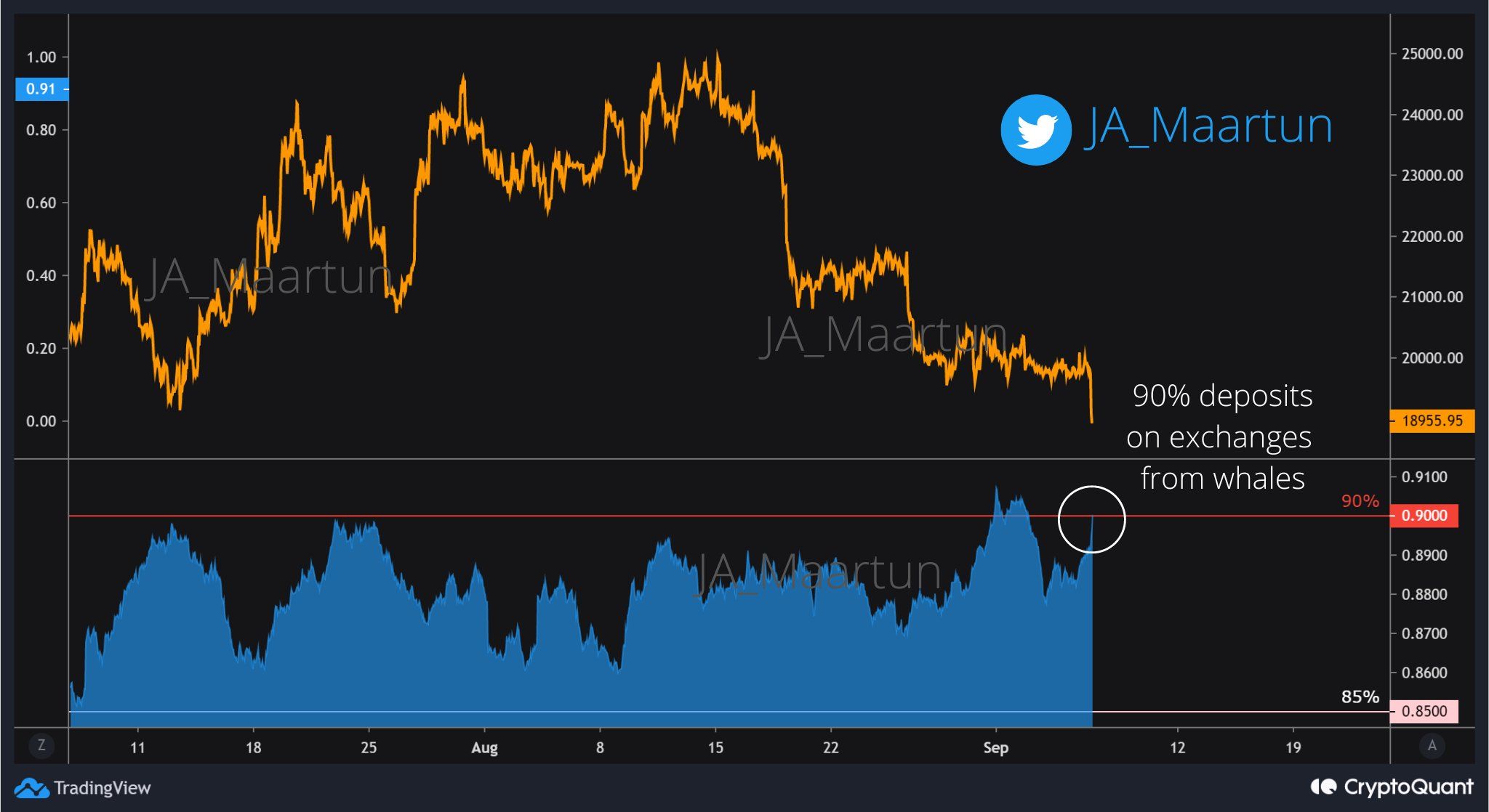 - Cú dump vừa qua đã ghi nhận 90% khối lượng giao dịch là đến từ các ví cá voi có số dư lớn. Lượng BTC này được nạp lên sàn gây thêm áp lực bán.