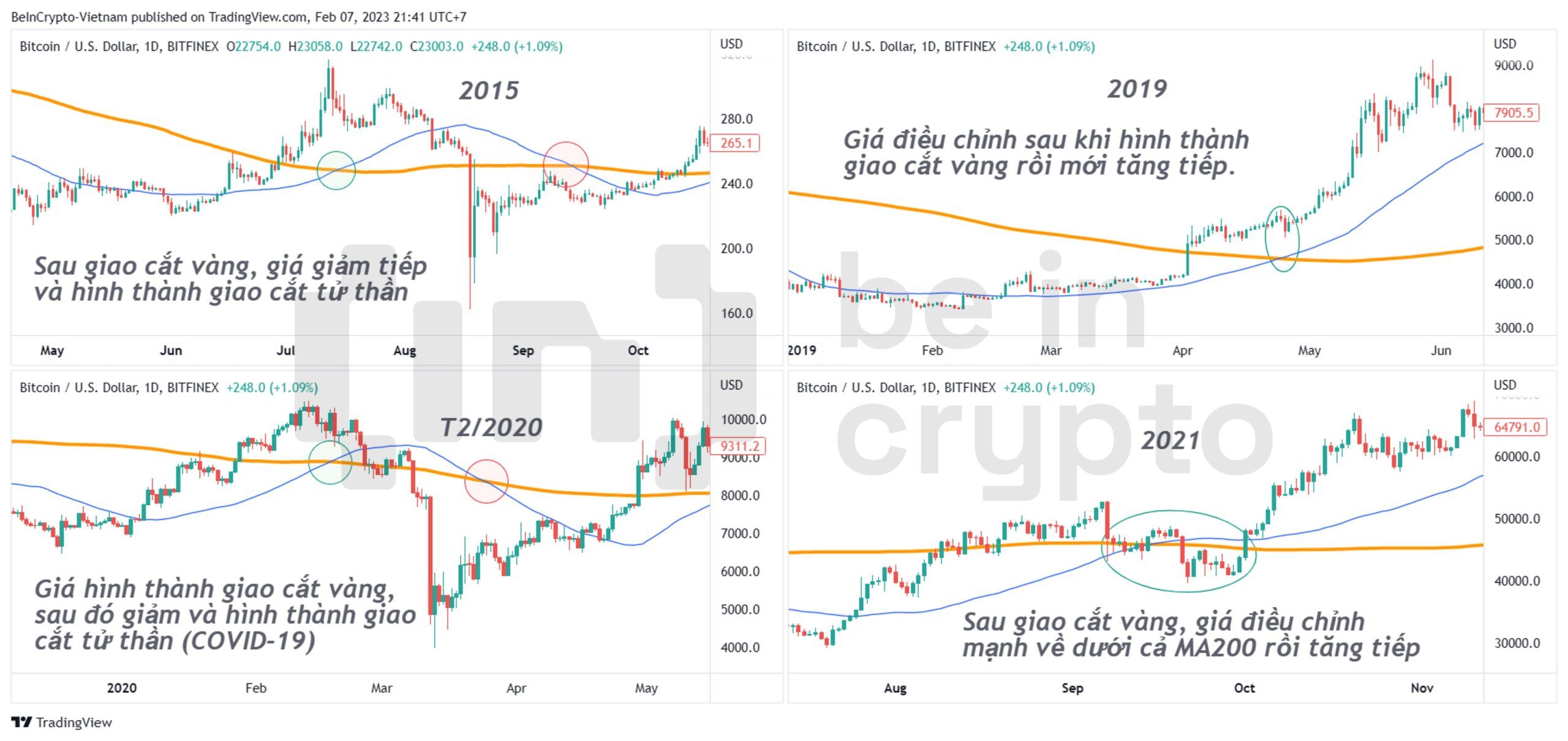 Sở dĩ người ta gọi nó là giao cắt vàng là vì nó hiếm (khung 1D) và thường đem lại lợi nhuận. Nhưng đồ thị giá Bitcoin cho thấy có những tình huống rất khó lường.