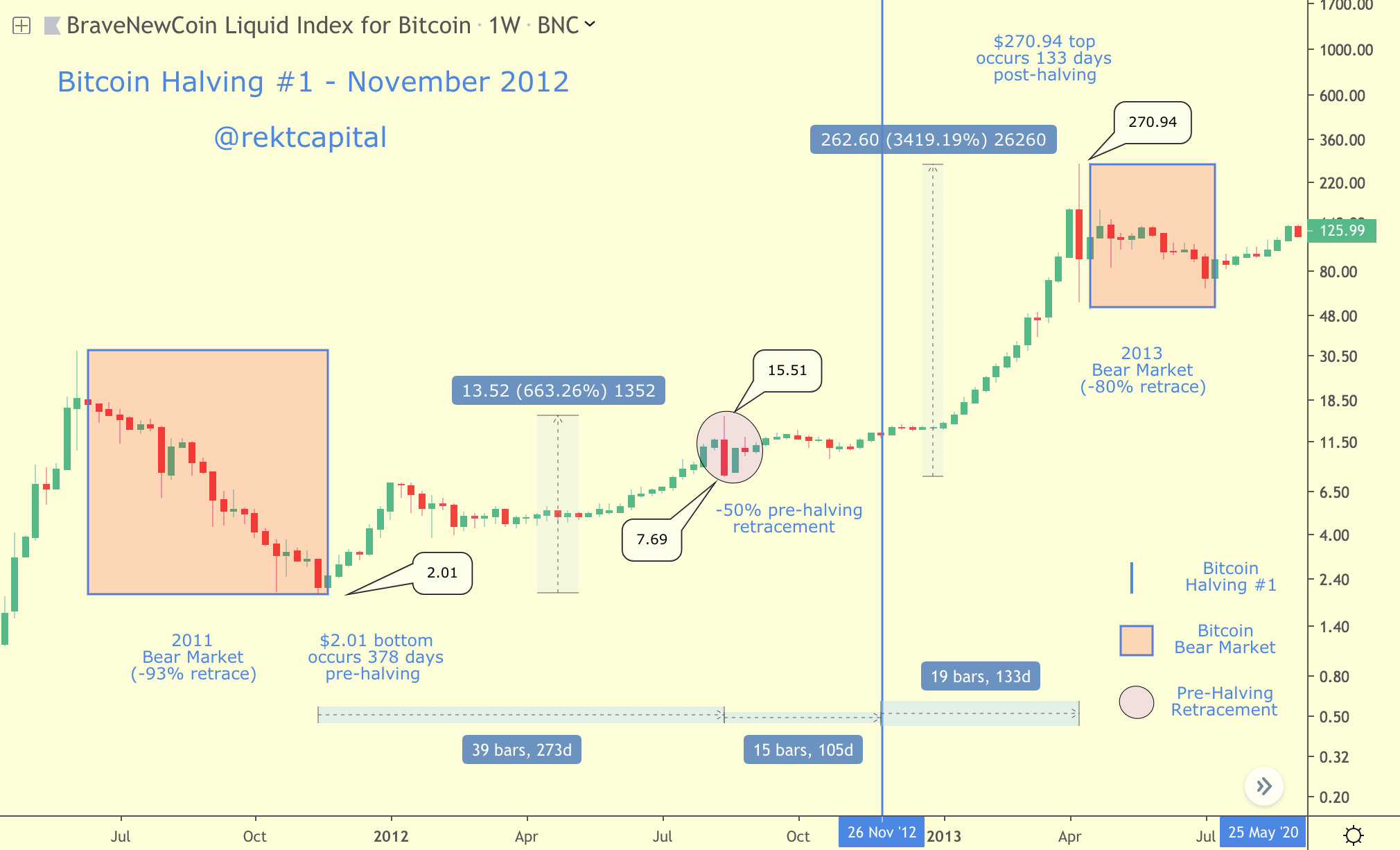 - Lần 1 năm 2012: Giảm đến 93% giá trị chỉ còn 2$ trước khi Halving 378 ngày