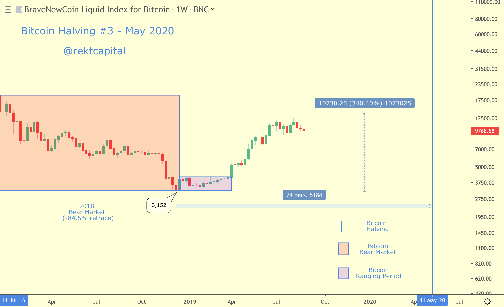 Từ phân tích mô hình giá 2 đợt trước và hiện tại, chúng ta thấy giá BTC đang đi khá giống với 2 lần trước. Giá rớt từ đỉnh cao nhất 20,000$ mất 84% giá trị chỉ còn 3,152$ là đáy thấp nhất, cũng ngay trước thềm Halving 518 ngày. Hiện tại giá BTC đang ở mức giá 9,100$, đang trong quá trình phục hồi lại đỉnh cũ và cũng đã tăng trưởng 340% từ đáy (giai đoạn 2), rất giống với lịch sử Halving lần 2.