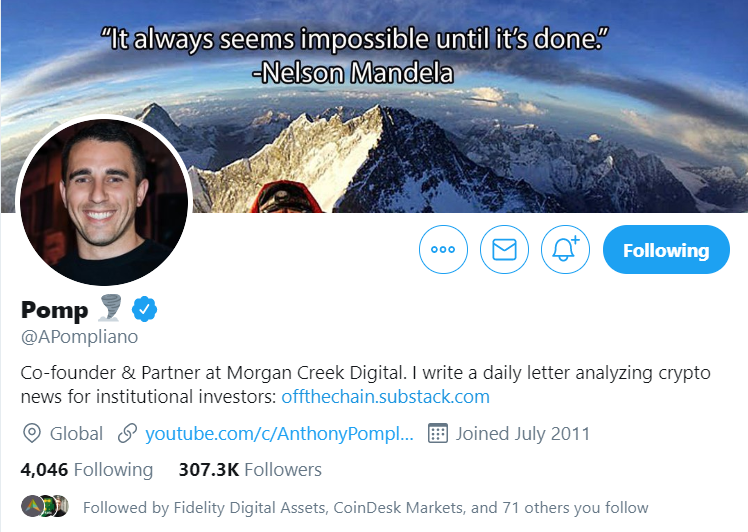 Pompliano – Người sáng lập công ty quản lý tài sản tiền điện tử Morgan Creek Digital Assets, là một trong số những người có sức ảnh hưởng lớn trong cộng đồng với hơn 300,000 người theo dõi trên Twitter, anh thường xuyên có những dự đoán chính xác ở quá khứ, cũng có cái nhìn lạc quan khi tuyên bố: