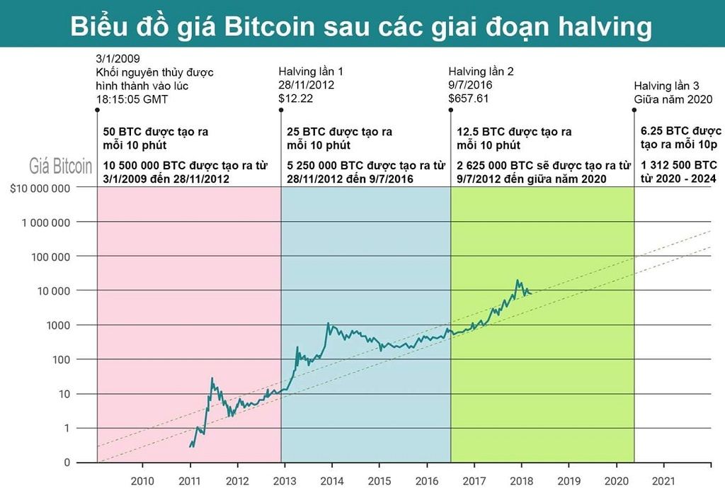 Và cứ chu kì như vậy thì khoảng 4 năm sẽ xảy ra một đợt Halving, sắp tới sẽ là đợt thứ 3, dự kiến sẽ xảy ra vào ngày 12/05/2020, khi phần thưởng mỗi khối giảm từ 12.5 BTC giảm còn 6.25 BTC.