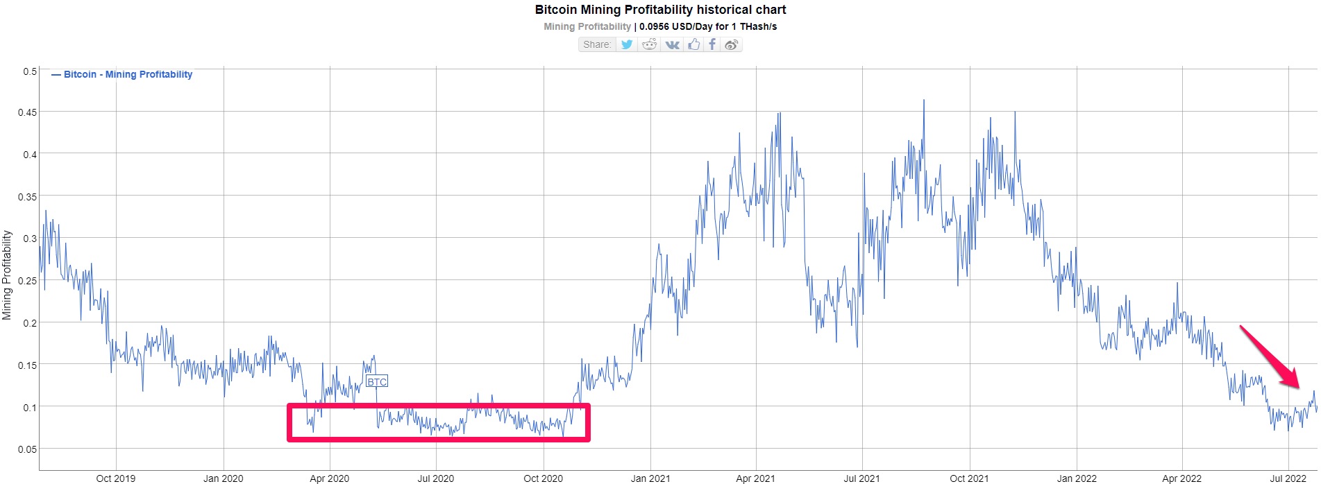 Thời điểm hiện tại, lợi nhuận đào Bitcoin ước tính (trên lý thuyết) chỉ đạt khoảng 0.1 USD/ ngày cho mỗi THash/s. Nghĩa là nó tương đương với giai đoạn hồi nửa sau năm 2020.