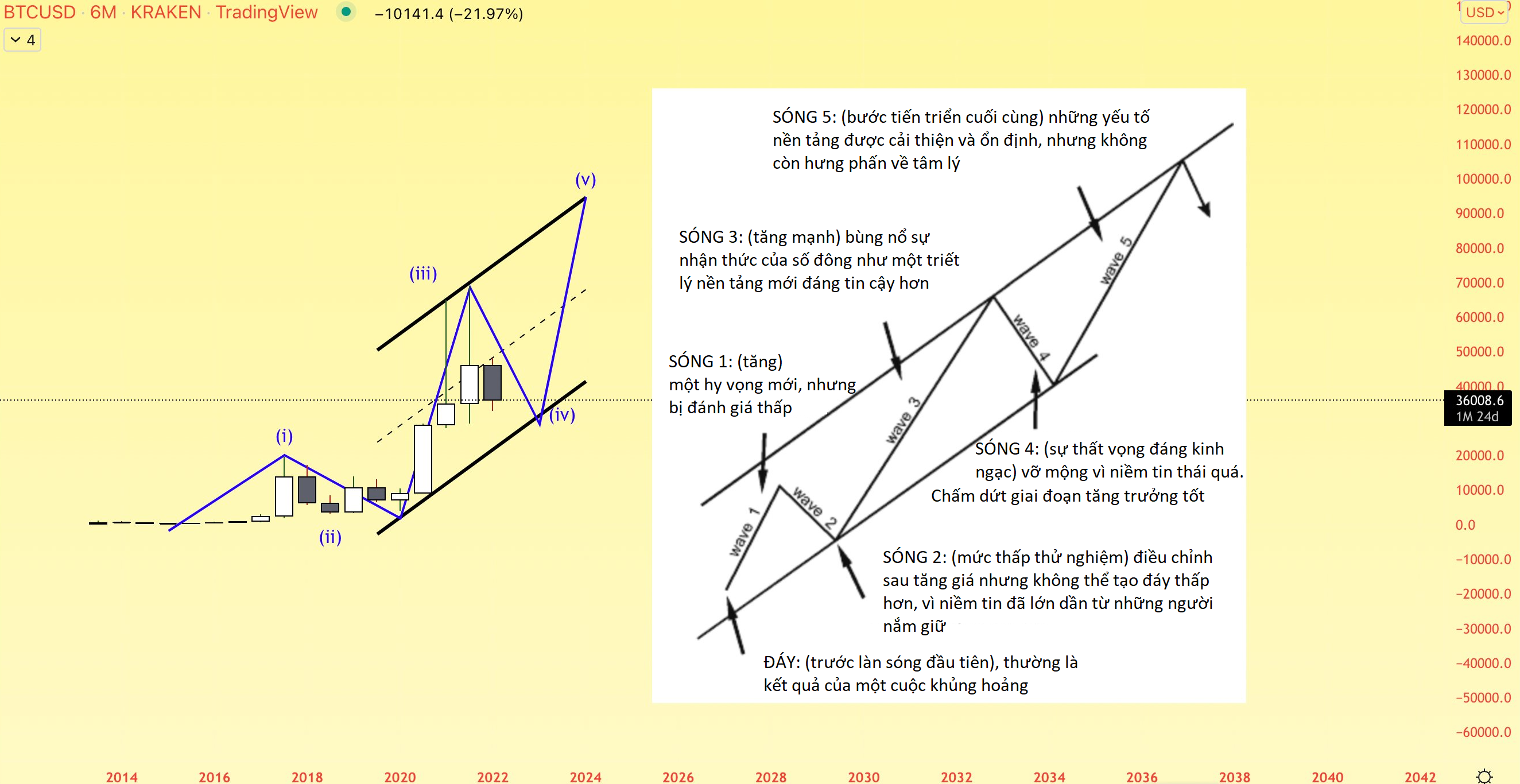 Lý thuyết sóng Elliot không đơn thuần là những đường vẽ mô hình, nhưng bên đó mang ý nghĩa chu trình tâm lý đám đông. Thử đặt toàn bộ lịch sử giá Bitcoin trong chu trình này, chúng ta có thể có được những góc nhìn tổng quát và một thoáng tương lai.