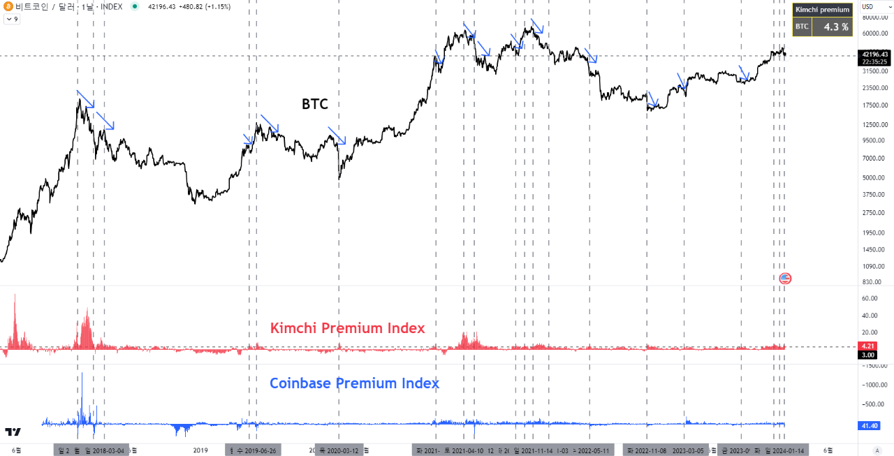 Theo dữ liệu được BeInCrypto ghi nhận từ CryptoQuant, bằng việc quan sát biểu đồ trong lịch sử cho thấy rằng mỗi khi chỉ báo Kimchi premium quá nóng (ở mức hơn 3%) và chỉ báo Coinbase premium chuyển sang vùng âm, điều đó có nghĩa là các nhà đầu tư Hoa Kỳ đang bán và các nhà đầu tư Hàn Quốc đang mua Bitcoin (BTC) một cách cạnh tranh. Trong trường hợp này, nó báo hiệu một sự điều chỉnh ngắn hạn trong thị trường giá lên và bắt đầu một thị trường giá xuống ở đỉnh.
