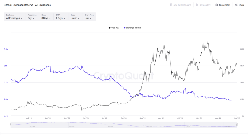 Cuối cùng, chúng ta có thể thấy bên dưới rằng tổng số Bitcoin có sẵn trên các sàn giao dịch đang ở mức thấp, chỉ có thể so sánh với năm 2018.