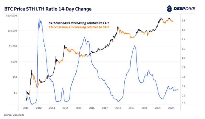Như chúng ta thấy trong biểu đồ, lượng BTC nắm giữ bởi những holder ngắn hạn so với những holder dài hạn ở mức rất thấp. Về mặt lịch sử, sau những mức này, giá Bitcoin có xu hướng tăng lên.