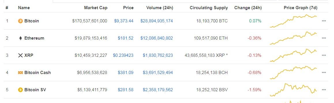 So với hôm qua, Bitcoin tăng 0,07%, giao dịch ở mức 9.373 USD. Trong số các đồng coin còn lại của top 3, Bitcoin SV giảm nhiều nhất với 1,59%, được giao dịch tại mốc 281 USD.