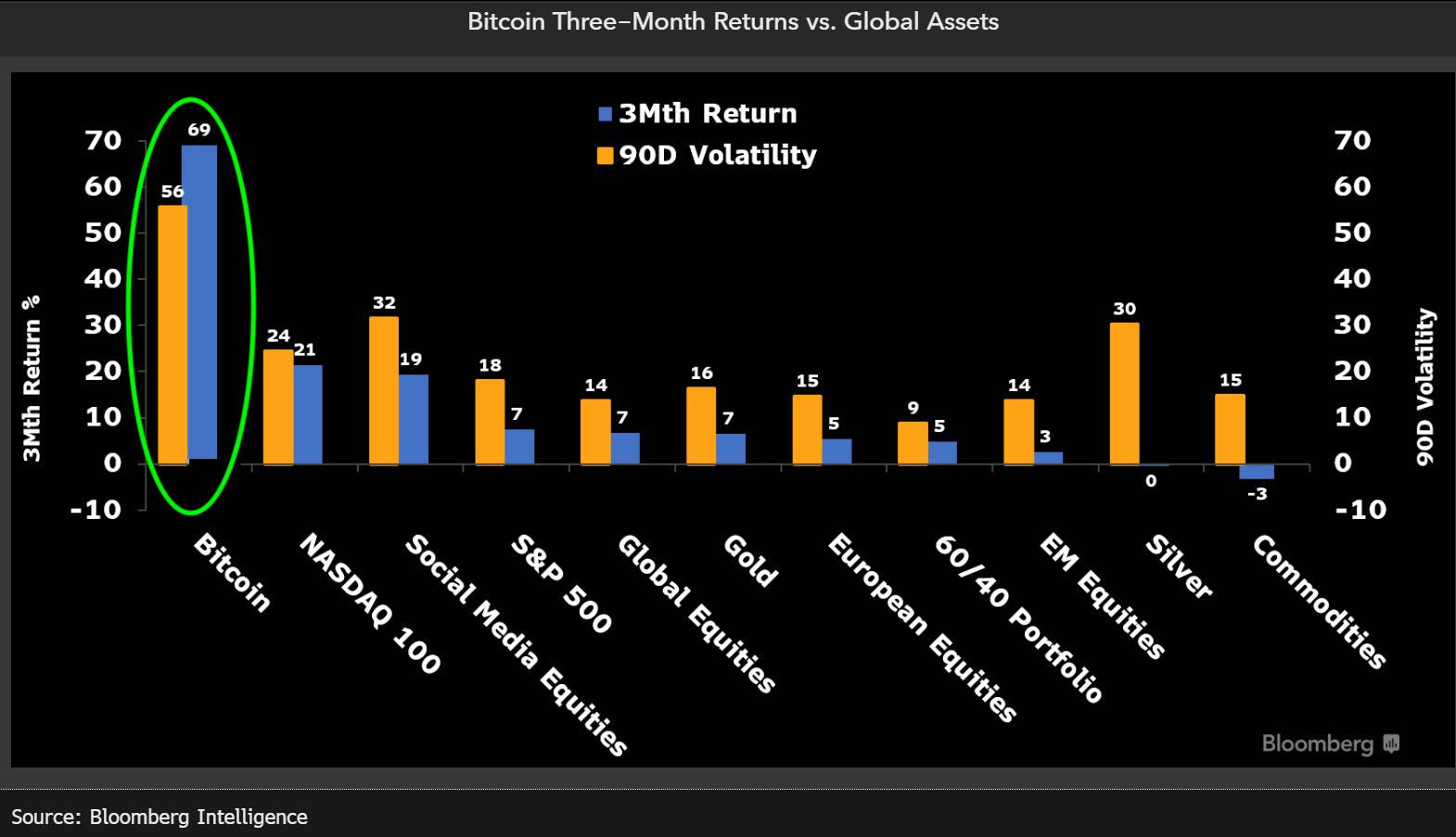 Sponsored- Trong 3 tháng qua, Bitcoin là tài sản có hiệu suất cao hơn hết các tài sản khác trên toàn cầu. Với hai thước đo, một là lợi suất trong 3 tháng và hai là biến động trong 90 ngày, Bitcoin đều vượt trội hơn cả. Có thể một phần vì thanh khoản kém hơn, nhưng nó vẫn cho thấy triển vọng như là một tài sản được tin tưởng trong bối cảnh hiện nay.