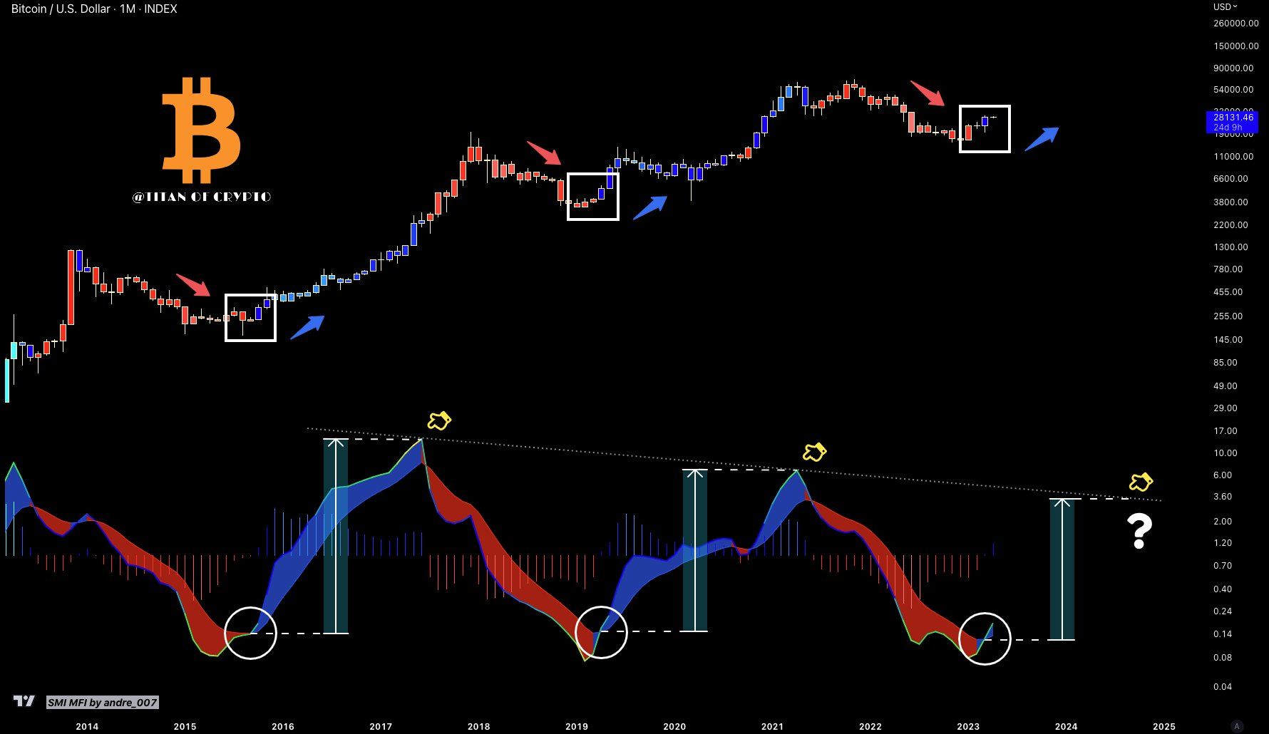 Chỉ báo Stochastic Momentum Index (SMI) được tính toán dựa trên sự khác biệt giữa giá đóng cửa, giá cao nhất và thấp nhất trong một chu kỳ (cụ thể ở đây là khung tháng) để tính toán xung lực tăng giảm. Còn chỉ báo Money Flow Index (MFI) thì được tính toán không chỉ dựa trên giá mà còn dựa trên khối lượng giao dịch trong chu kỳ đó. Bằng cách kết hợp cả hai lại với nhau, biểu đồ sau thể hiện xung lực tăng giá của BTC đã hình thành.