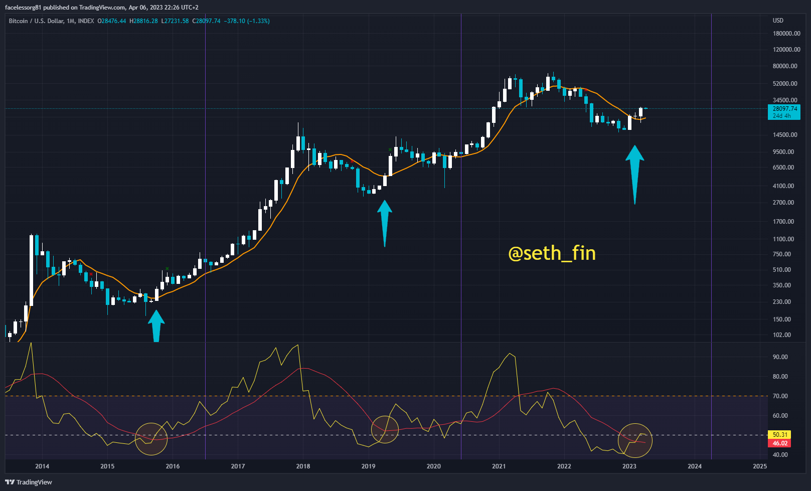 RSIOMA là chỉ báo bổ sung thêm đường MA cho chính RSI. Biểu đồ trên chỉ ra rằng, khi RSIOMA xuất hiện giao cắt dương và đồng thời BTC đóng nến tháng trên MA10 thì đó là lúc đà tăng chỉ mới bắt đầu. Tín hiệu này đã chính thức được xác nhận trong tháng 3 vừa qua. Giá mua lại lúc này để đón sóng tăng là tại MA10 khung tháng tương đương vùng 25,000 USD.