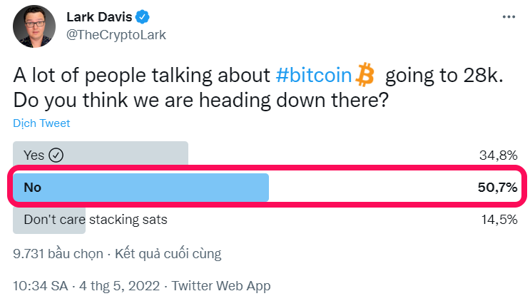 Trong một mẫu khảo sát khác với hơn 9,700 bình chọn, thì 50.7% cho rằng Bitcoin sẽ không về vùng giá 28,000 USD. Ngược lại với kết quả trên, nhà giao dịch kỳ cựu Peter Brandt chia sẻ rằng “Dự đoán của tôi là 28,000 USD”.