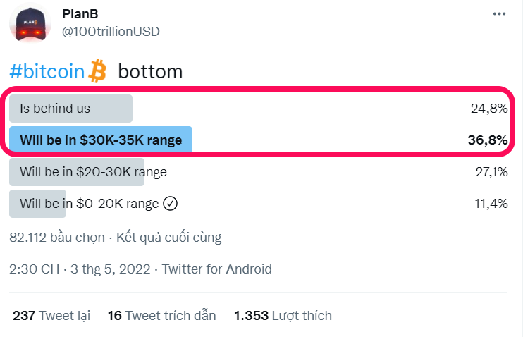 Khi PlanB hỏi về giá đáy Bitcoin thì nhận được hơn 82,000 bình chọn. Trong đó, 24.8% cho rằng Bitcoin đã lập đáy. Và 36.8% cho rằng Bitcoin sẽ lập đáy ở vùng 30,000 ~ 35,000 USD. Như vậy, hơn 61% cho rằng Bitcoin sẽ không về dưới mức giá 30,000 USD. Riêng gần 40% còn lại thì cho rằng Bitcoin sẽ còn giảm sâu hơn.