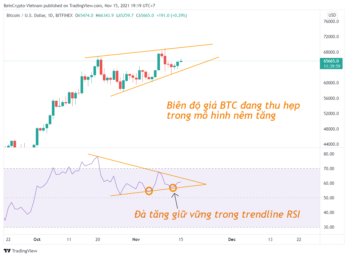 - Nhìn toàn bộ biến động giá Bitcoin từ lúc lập đỉnh 20/10 đến nay, thì đường giá đang dần hình thành mô hình nêm tăng (chưa hoàn thiện). Mô hình này theo lý thuyết phân tích kỹ thuật, nó dự báo giảm giá trong tương lai. Nhưng có thể thấy, mô hình còn thiếu một lần chạm trendline chéo bên trên.
