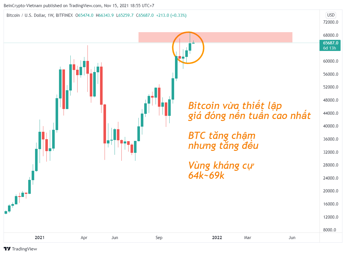 Tuần mới bắt đầu, và Bitcoin vừa thiết lập giá đóng nến tuần cao nhất mới. Đây là tuần thứ 2 liên tiếp giá đóng nến ở mức cao hơn. Có thể thấy, Bitcoin đang tăng chậm, nhưng tăng đều.