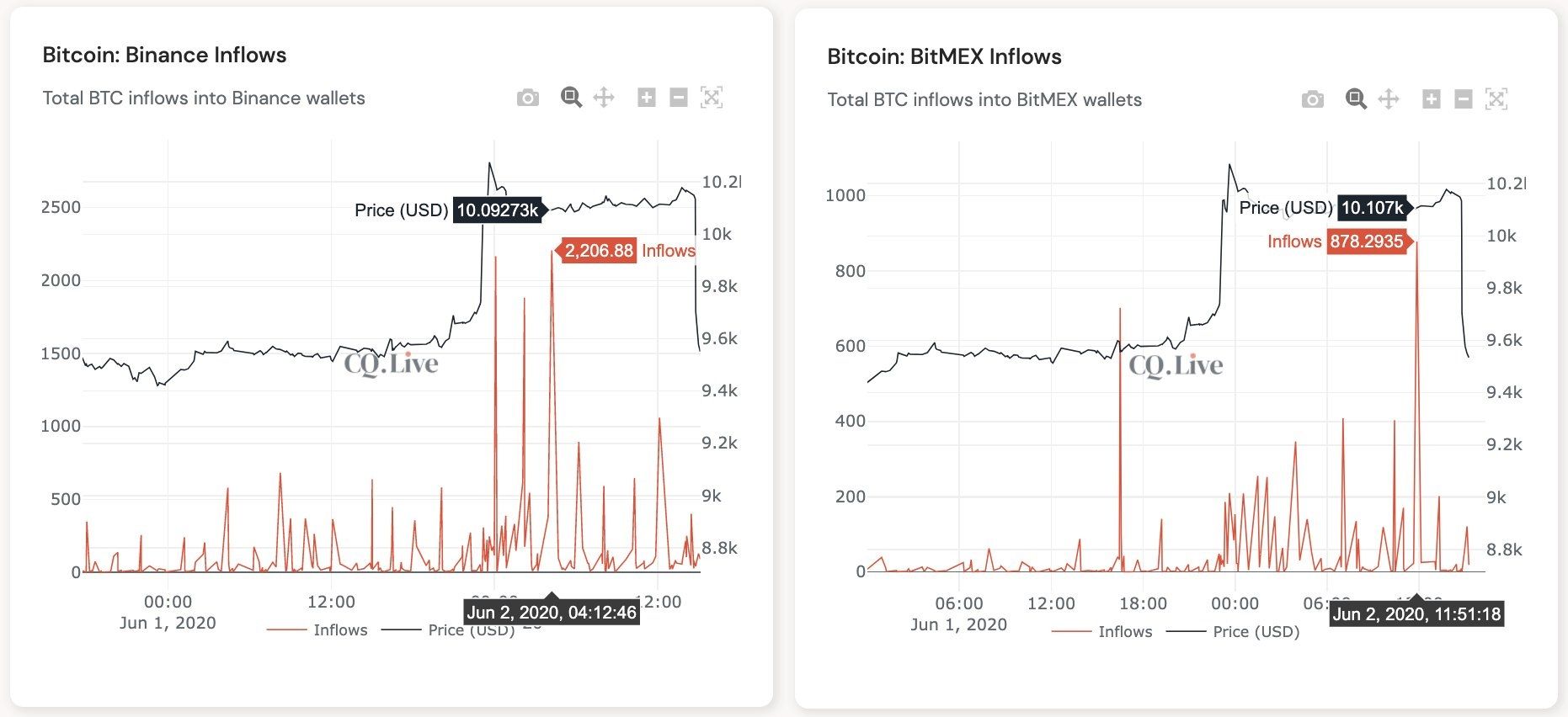 “Số lượng lớn BTC đã chảy vào các ví trên Binance và BitMEX chỉ một vài giờ trước khi chạm đáy.” – @ki_young_ju
