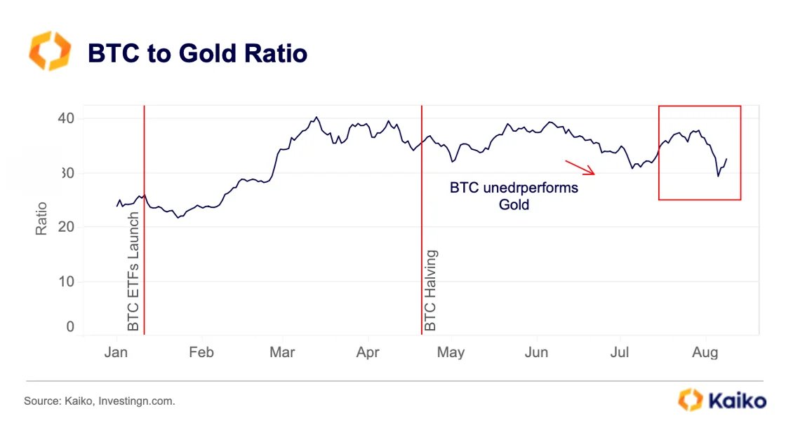 Giá vàng lần đầu vượt 2,500 USD trong lịch sử, nhiều dự đoán cho rằng đà tăng này sẽ vẫn chưa dừng lại trong năm 2024. Nếu so sánh tỷ lệ Bitcoin/Vàng, có thể thấy tỷ lệ này đang có khuynh hướng giảm mạnh trong tháng 8, và đang giảm về mức thấp nhất kể từ tháng 3 đầu năm.