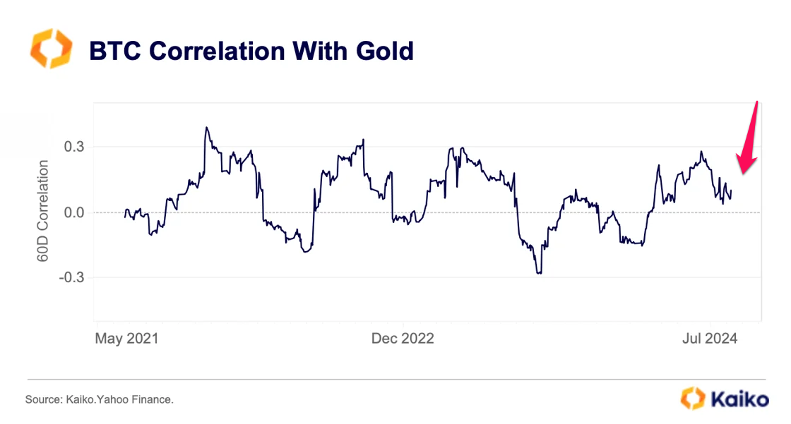 Biểu đồ Kaiko về điểm tương quan giữa Vàng và Bitcoin cho thấy đã giảm mạnh trong năm 2024 chứ phải đến tháng 8 mới giảm. Điểm tương quan dương và tiến gần về zero cho thấy mối tương quan thuận (đồng biến) càng yếu, nếu điểm tương quan này âm trong thời gian tới, có nghĩa cả hai sẽ duy trì mối tương quan nghịch (nghịch biến).