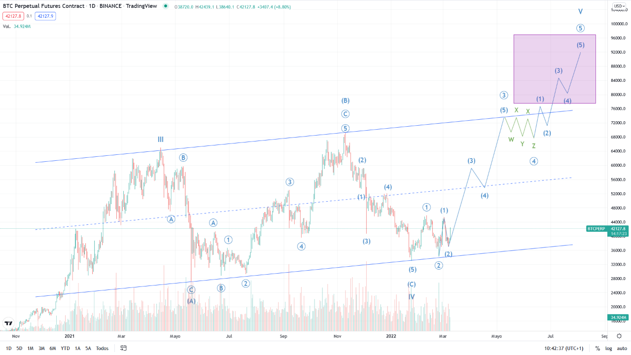Dự đoán này vẽ ra 5 sóng Elliot bắt đầu từ vùng đáy 37,000 USD và đạt đỉnh ở ATH mới trên 70,000 USD. Toàn bộ cấu trúc tăng vẫn nằm trong một Pitchfork lớn.