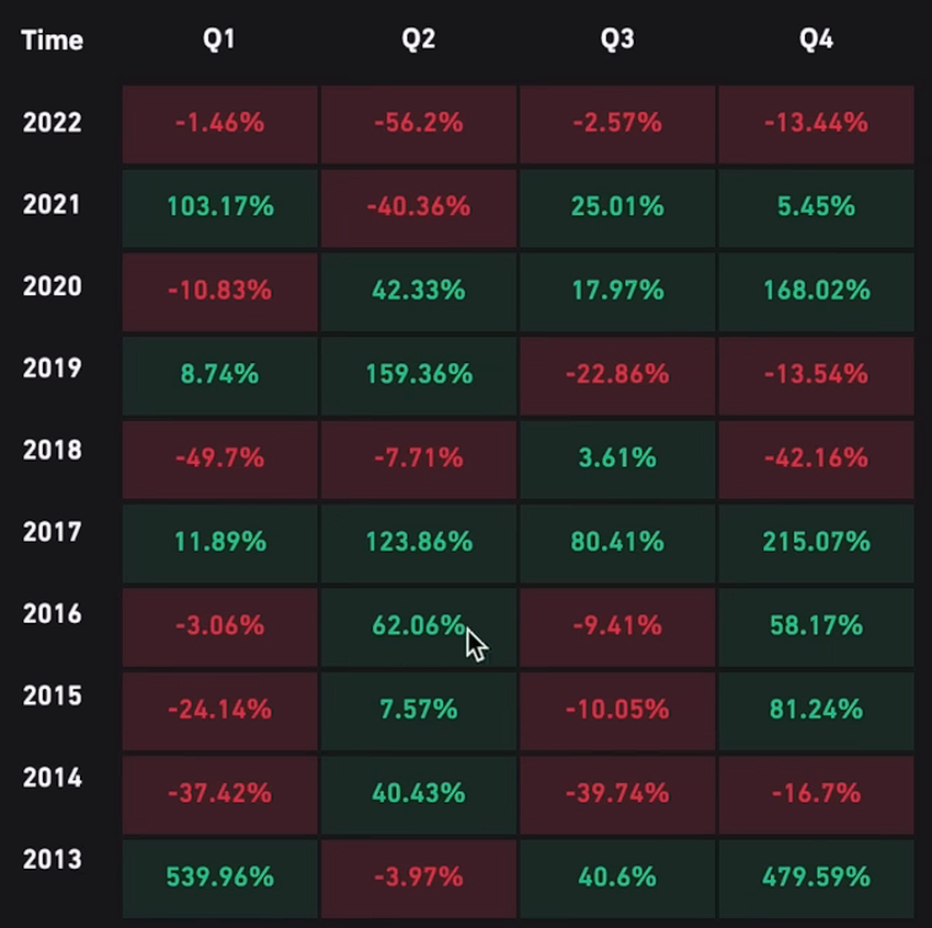 Trong một video YouTube gần đây, nhà phân tích thị trường tiền điện tử nổi tiếng, Jason Pizzino, cũng đã đề cập đến tình trạng này trong biểu đồ Bitcoin hàng quý. Anh ấy đã đưa vào ROI của tất cả các quý trong lịch sử Bitcoin.
