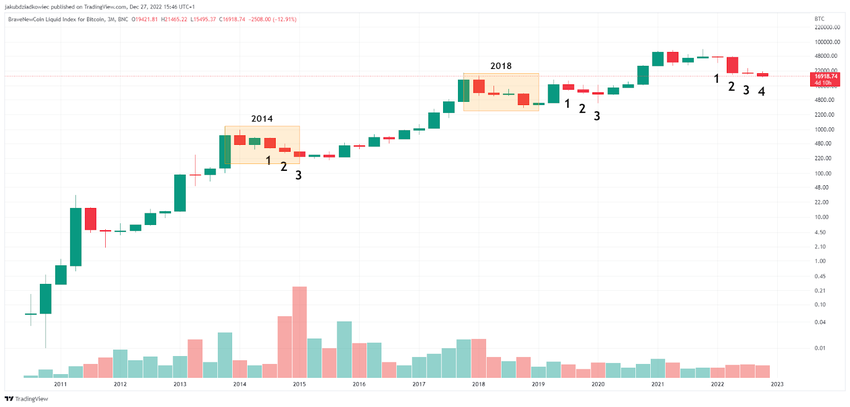 Nhìn vào lịch sử giao dịch BTC, chúng ta thấy rằng chưa có bất kỳ năm nào, cả 4 cây nến quý đều có màu đỏ. Hơn nữa, chưa bao giờ trong lịch sử biểu đồ quý có 4 cây nến đỏ liên tiếp xuất hiện. Như hình phía dưới, chỉ trong hai tình huống (2014/2015 và 2019/2020) giá Bitcoin mới tạo ra 3 nến đỏ liên tiếp. Trong khi đó, chỉ 2 năm chúng ta chứng kiến 3/4 quý giảm giá. Trong năm 2014 và 2018, đối với cả hai trường hợp thì vẫn có một nến quý có màu xanh lục (khu vực màu cam).