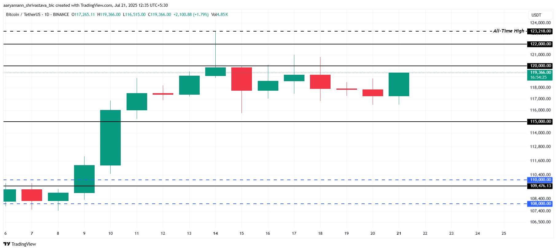 Tại thời điểm viết bài, giá Bitcoin là 119,366 USD. Gã khổng lồ tiền điện tử này đang gặp khó khăn trong việc vượt qua mức kháng cự 120,000 USD. Sự suy giảm về sự thống trị của nó cho thấy vốn đang chuyển sang altcoin, làm giảm khả năng bứt phá trên rào cản này trong tương lai gần.