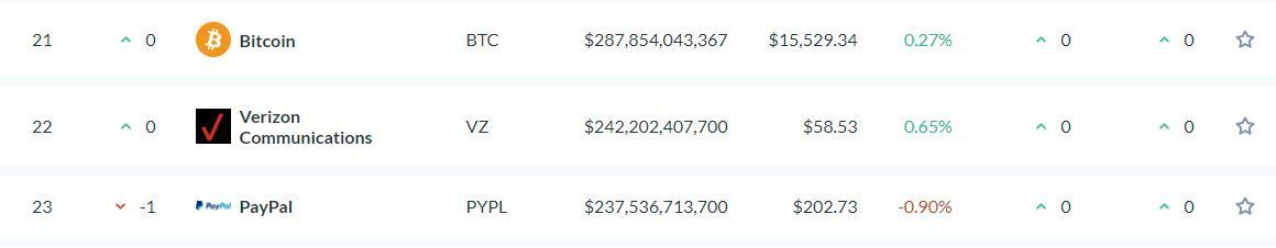 Nằm giữa Verizon và Home Depot, Bitcoin hiện giờ một trong những tài sản lớn nhất thế giới, theo assetdash.com. Những vị trí đầu trong danh sách bao gồm những tập đoàn lớn như: Apple, Amazon và Alibaba.