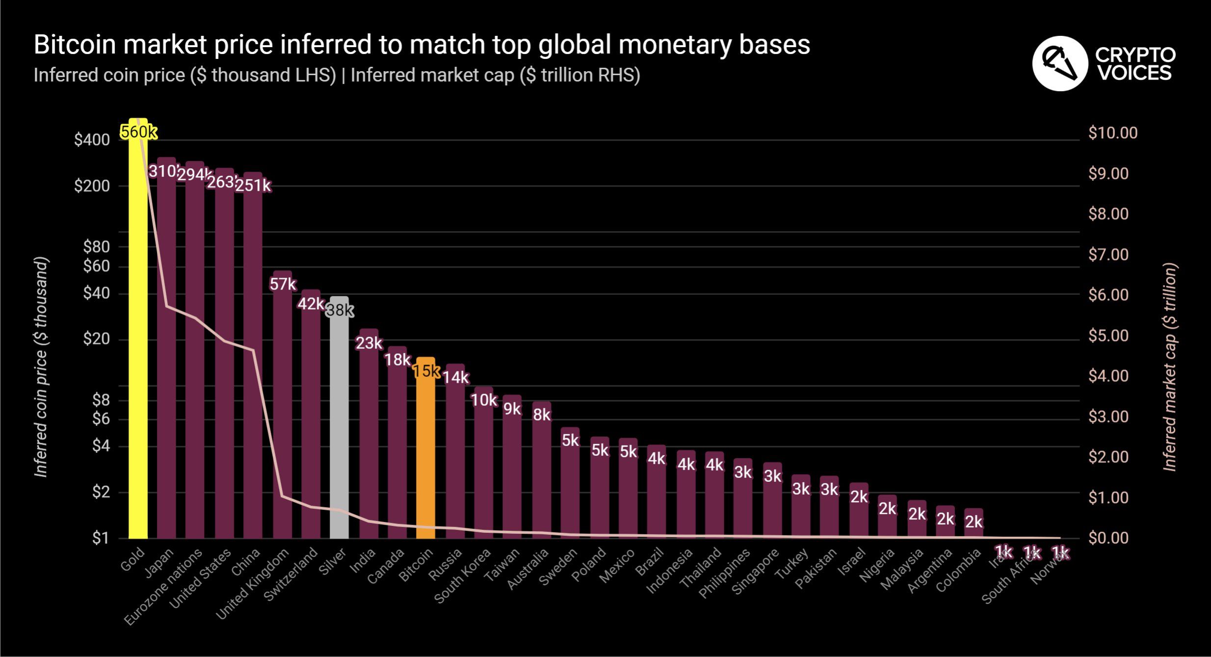 Mỹ có một cơ sở tiền ước tính 3,9 nghìn tỷ USD trong năm 2016. Nhật Bản có cơ sở tiền cao hơn nhiều so với hầu hết các quốc gia khác. Nếu vốn hóa thị trường Bitcoin tương đương với cơ sở tiền của mình thì nó sẽ được xếp hạng ở một vị trí thực sự cao. Crypto Voices cho biết, thế giới với hơn 14.000 USD trên một Bitcoin là một thế giới mà đồng tiền kỹ thuật số này trở thành một tay chơi lớn.