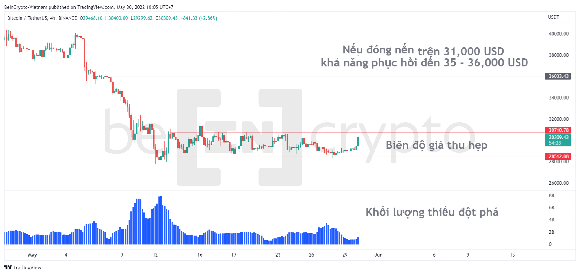 Dưới góc nhìn phân tích kỹ thuật, hành vi giá bức phá một trong hai trendline của biên độ trên sẽ mang tính quyết định cho một đường giá dài hơn. Ở góc nhìn tích cực, một nến pump 10% và đóng nến ngày trên 31,000 USD sẽ kéo theo khả năng BTC phục hồi lên vùng 36,000 USD.