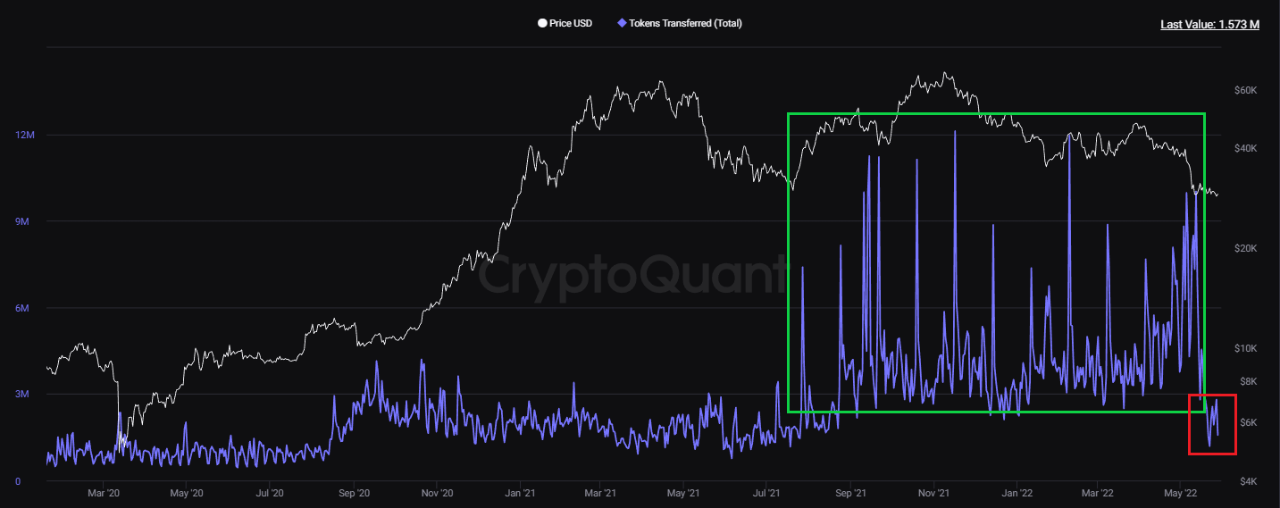 Hoạt động chuyển BTC trên chuỗi cũng giảm mạnh.