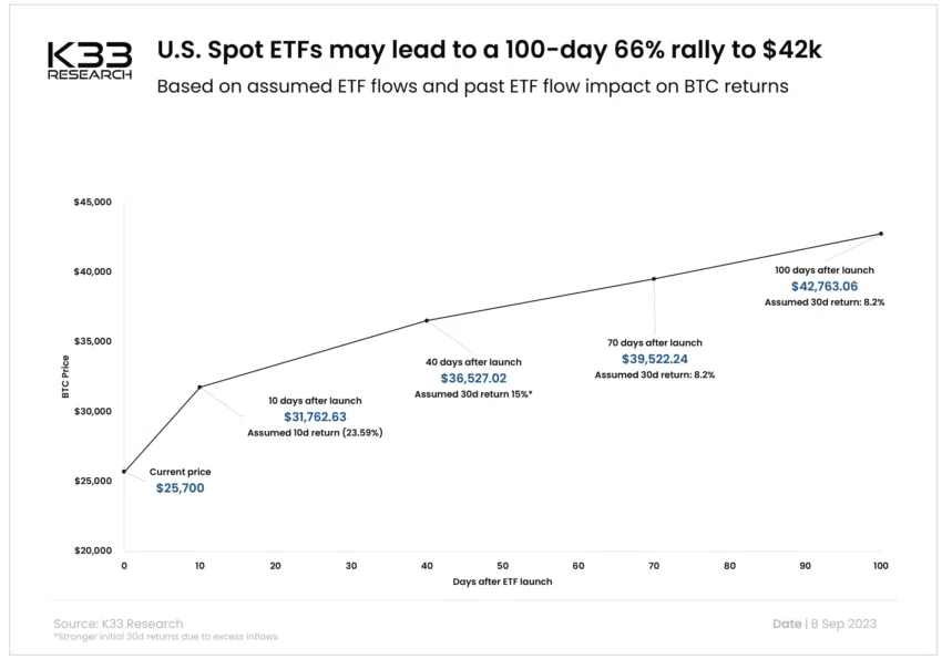 Theo K33 Research, việc bật đèn xanh cho Bitcoin Spot ETF có thể thúc đẩy một đợt tăng giá lên đến 66%. Do đó, nếu giả thuyết này là thật, có khả năng đẩy giá Bitcoin lên tới 42,000 USD trong 100 ngày đầu tiên kể từ khi được chấp thuận.